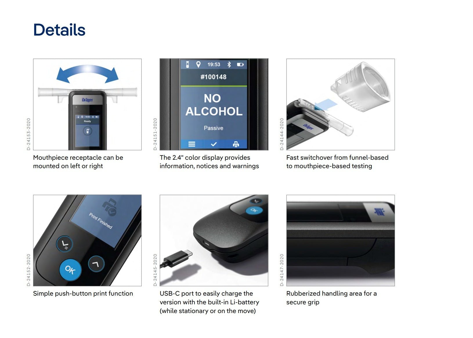 Hygiene is an increasingly important part of our everyday lives. Dräger Alcotest breath-alcohol detection devices use non-invasive measuring technologies with a high degree of hygiene – for the user as well as the test subject thanks to the following features: